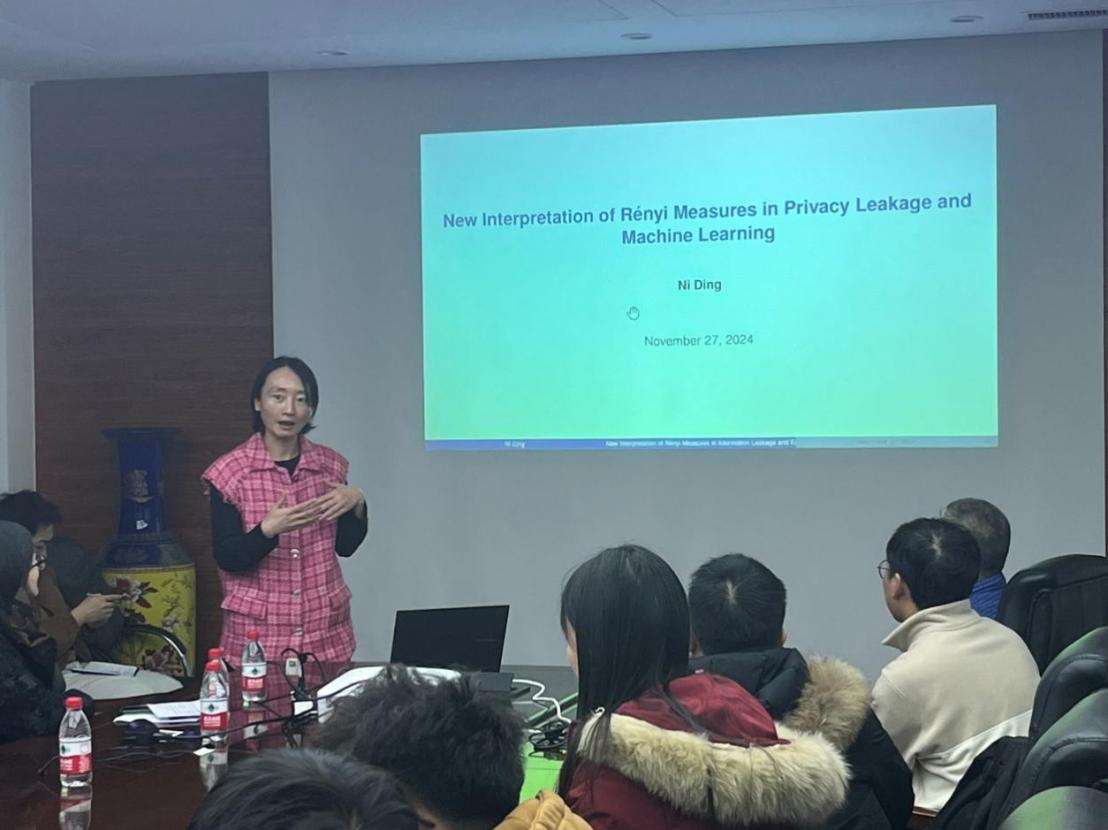 2024年11月27日,奥克兰大学丁妮博士应动漫屋 邀请,在中心教学楼举分别作题为“隐私泄露与机器学习中的Rényi度量新解释”、“通过Kantorovich最优传输计划实现ε-Pufferfish隐私”的学术讲座,,讲座分别由动漫屋 礼欣老师、胡晶晶老师主持,语言智能与社会计算研究所和网络攻防对抗研究所相关专业方向师生参加了讲座。
